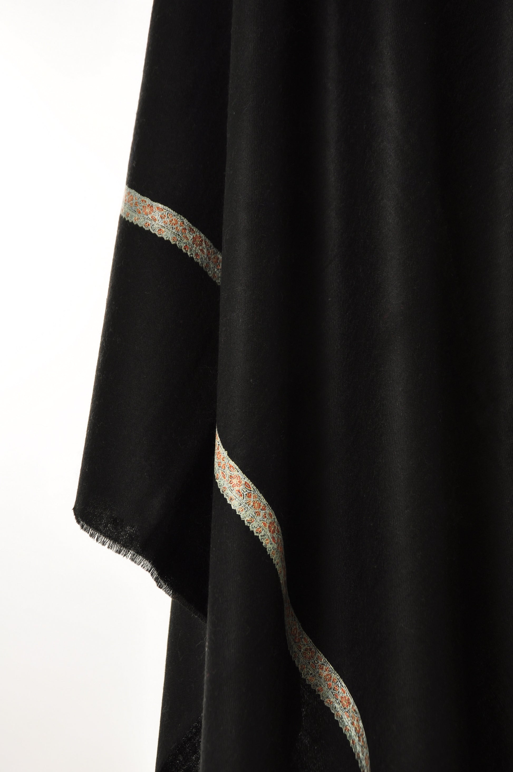 This black pashmina carries a single, delicately embroidered motif placed near the border. Its design features a paisley in soft ivory and muted orange tones in the corner of the shawl.
