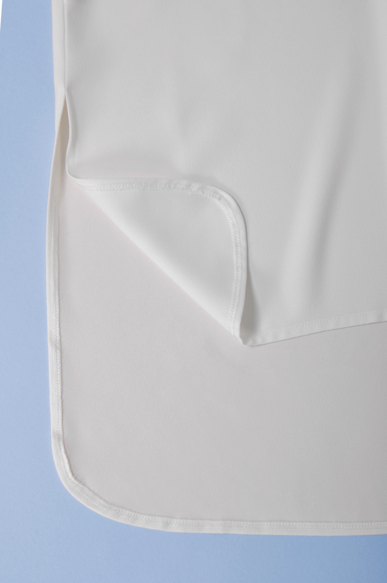 Off-White sleeveless top , with round edges , short in front and long at the back .